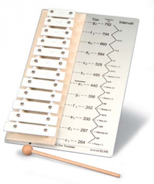 Metallophon zur Demonstration der C-Dur- Tonleiter von c1 bis g2. Tonbezeichnungen, Frequenzen und Frequenzverhältnisse sind aufgedruckt. Mit Anschlaghämmerchen.