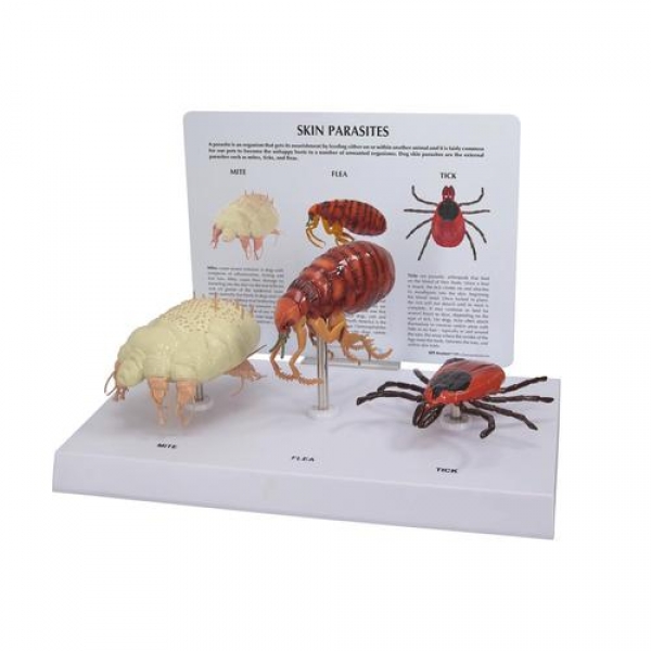Dieses Modell hier zeigt sehr detailliert die 3 häufigsten externen Parasiten, darunter eine Milbe, einen Floh und eine Zecke.