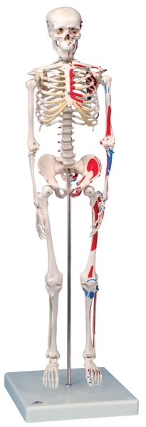 Wie A18, jedoch mit farbiger Darstellung der Muskelursprunge (rot) und –ansätze (blau) auf der linken Hälfte. Die Muskeln sind nummeriert.