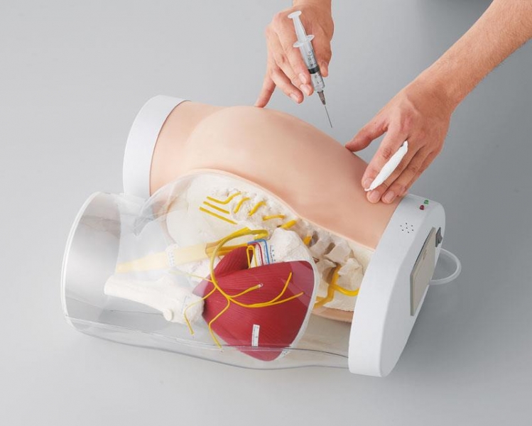 Der Lernende kann die auf der rechten Seite sichtbare Anatomie dann auf die linke Seite übertragen und dort die intramuskuläre Injektion praktisch üben.