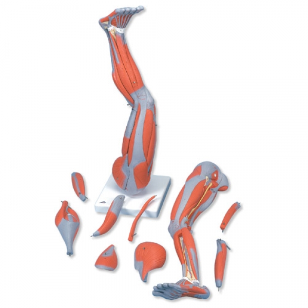 Das Modell zeigt die oberflächlichen und tieferliegenden Muskeln des linken Beins mit Fuß, von denen Sie acht abnehmen und detailliert studieren können. Muskeln, Sehnen, Gefäße, Nerven und Knochenpartien sind akkurat dargestellt und nummeriert. Lieferung auf abnehmbarem Sockel.