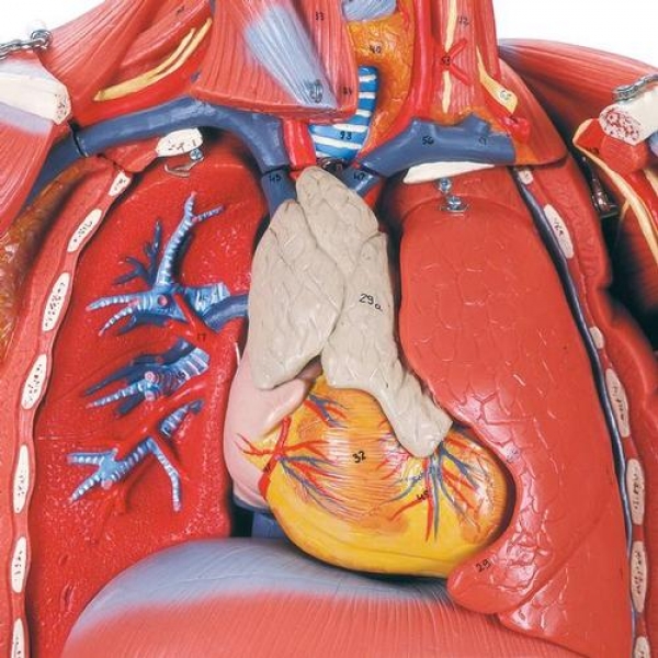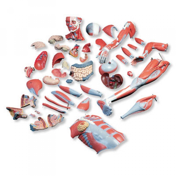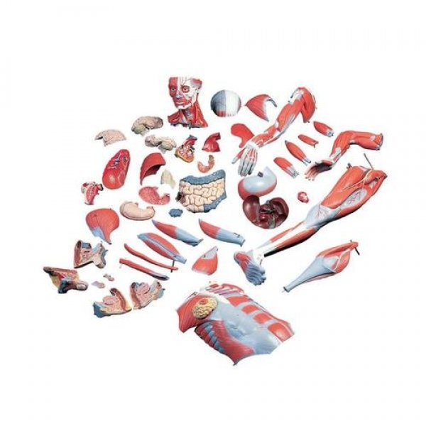 Das absolut herausragende Modell für die medizinische Ausbildung! Die 138 cm große Nachbildung eines Menschen zeigt die tiefe und oberflächliche Muskulatur, die wichtigen Nerven, Gefäßverläufe sowie alle inneren Organe in vortrefflicher Detailtreue. Die Figur kann in 45 Teile zerlegt werden und eröffnet so einen fundamentalen Einblick in die Zusammenhänge des menschlichen Körperbaus. Entfernen Sie das Schädeldach zum eingehenden Studium der inneren Schädelstrukturen und des 3-teiligen Gehirns. Schauen Sie unter die Leber zur Ansicht von Gallenblase und Gallengang, blicken Sie in das Innere von Blinddarm, Magen, Lunge, Herz oder Niere. Betrachten Sie die Details der 13 abnehmbaren Arm- und Beinmuskeln, wechseln Sie die Geschlechtseinsätze aus und, und, und... Die ideale visuelle Unterstützung erleichtert auch Ihren Zuhörern das Verständnis sehr. 662 anatomische Strukturen wie Muskeln, Gefäße, Nerven und Organe sind nummeriert und in einem mehrsprachigen Beiblatt benannt. Hand bemalt und auf einem praktischen Rollenstativ montiert, erhalten Sie diese Muskelfigur u.a. mit folgenden heraus- bzw. abnehmbaren Teilen: