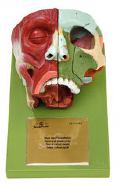 ca. 2fach vergrößert, aus SOMSO-Plast®. Ausführung wie FS 3, jedoch sind die Knochen der Schädelbasis coloriert. In 6 Teile zerlegbar. Auf grünem Sockel.