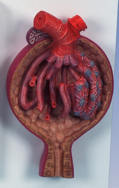 Dieses Modell zeigt ein Nierenkörperchen in 700- facher Größe. Auf Grundbrett montiert.