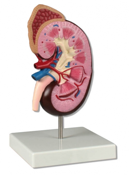 Dieses Modell zeigt in handbemaltem Detail Nierenbecken, Nierenmark, Nierenkelche, Nierenrinde, Nierenarterie und -vene, Harnleiter sowie die Nebenniere.