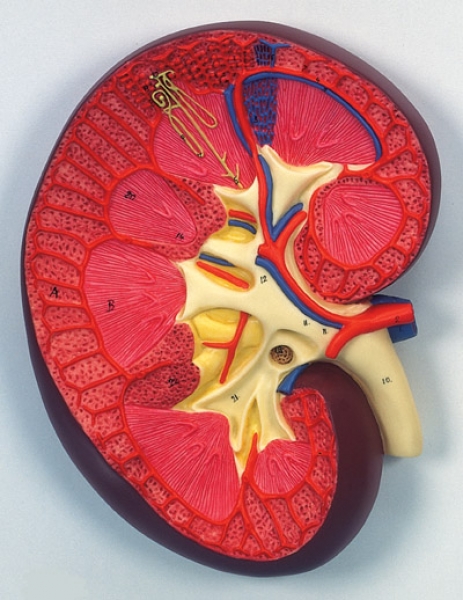 Modellhafter Nierenschnitt in 3- facher Größe. Längsschnitt der rechten Niere. Auf Grundbrett montiert.