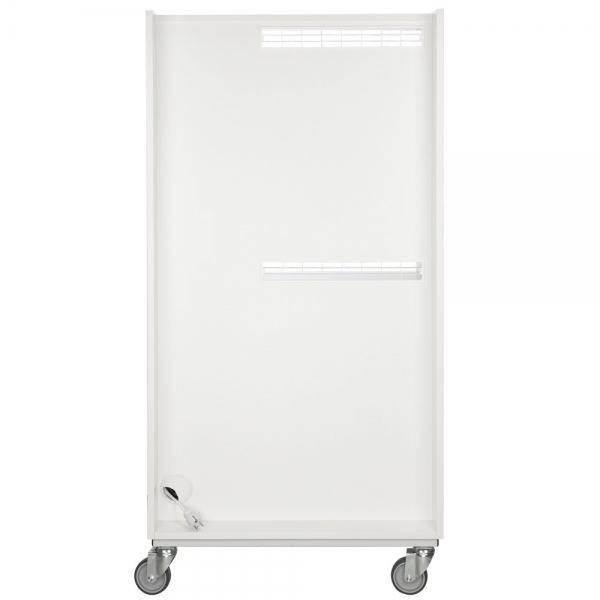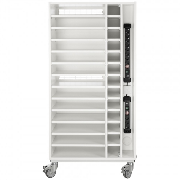 Das Notebookregal bietet Platz für 13 Notebooks bis zu 17" (Fachmaß: B/T 50x34 cm). Auf der rechten Seite befinden sich 2 x 8 Steckdosenplätze, die 2 Steckdosenleisten sind separat schaltbar. Die Notebookfächer befinden sich auf der linken Seite. An der Rückseite befinden sich zwei Lüftungsgitter. Eine zurückgesetzte Rückwand von 10 cm sorgt für zusätzlichen Stauraum von Kabeln und Zubehör.