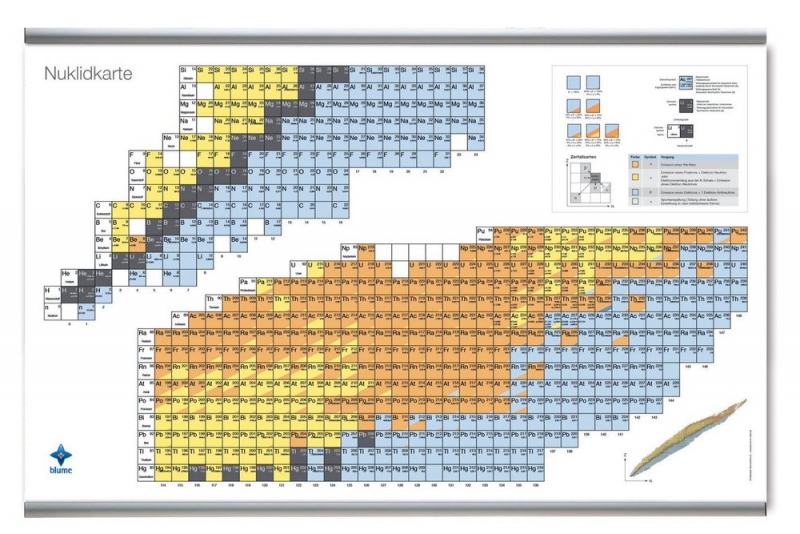 Unsere Nuklidkarte bildet didaktisch optimiert über 3.000 aktuell experimentell nachgewiesene Nuklide ab. Die Karte liefert über 10.000 hoch präzise Daten auf der Basis des renommierten National Nuclear Data Center des Brookhaven Instituts (USA). Für Unterricht, Studium und Forschung in den verschiedenen Fachbereichen liegt der hohe didaktische Wert insbesondere in der lesbarkeitsoptimierten Darstellung der Daten im Zusammenspiel mit dem auf das jeweilige Einsatzgebiet abgestimmten Formats.