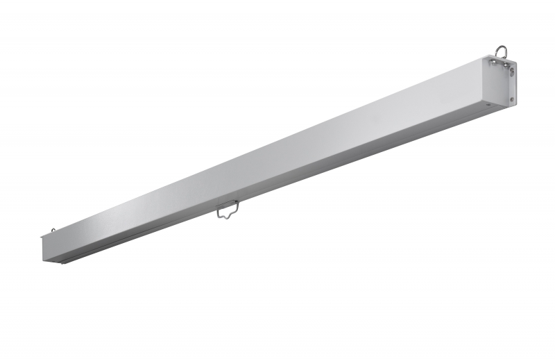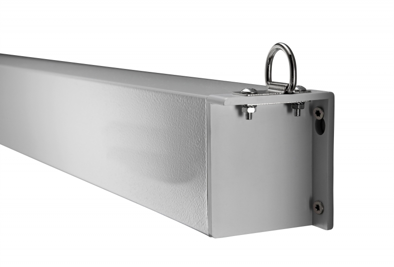 Ausführung: planhängendes Polyestermaterial, zur Wand- und Deckenmontage geeignet, mehrstufig arretierter, weißes Gehäuse.
