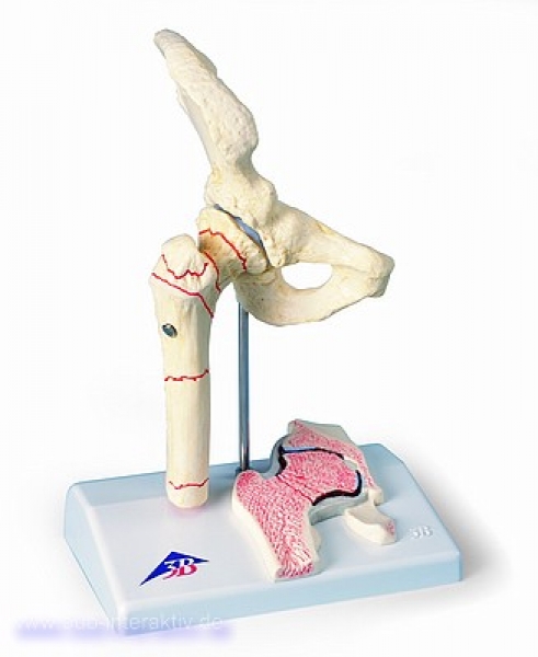 Dieses Modell wurde zur Unterstützung einer verständlichen Patientenaufklärung, z.B. vor Operationen, entwickelt. Es zeigt das rechte Hüftgelenk eines älteren Menschen in halber natürlicher Größe. Zusätzlich ist auf dem Sockel ein Frontalschnitt durch den Schenkelhals im Relief dargestellt. Das Modell zeigt die in der Praxis am häufigsten vorkommenden Oberschenkelbrüche (Femurfraktur) sowie typische Verschleißerscheinungen am Hüftgelenk (Koxarthrose oder Hüftgelenkarthrose). Folgende Brüche sind dargestellt: