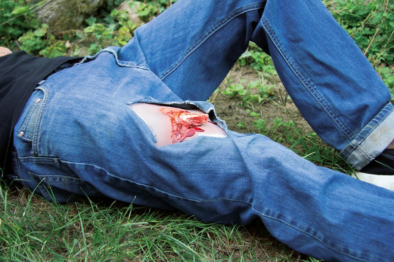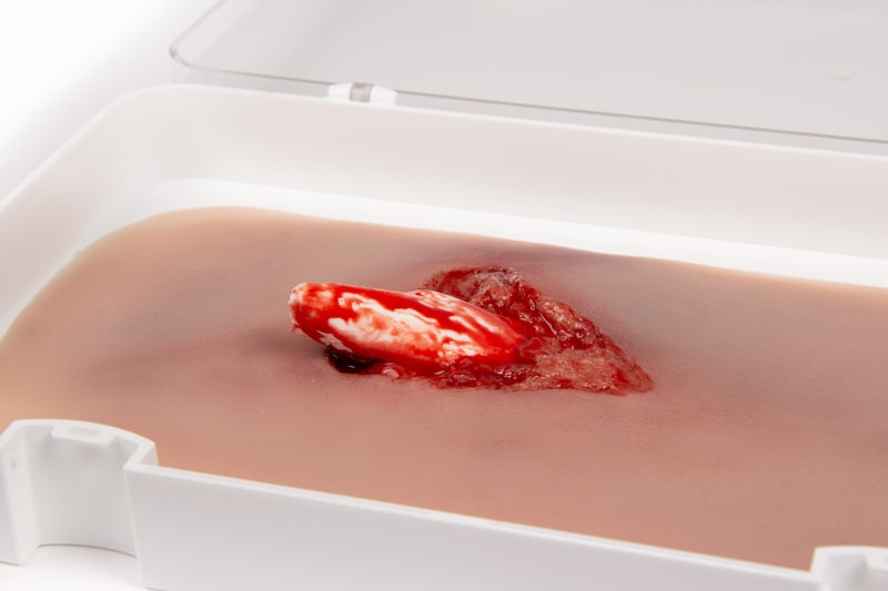 Diese Moulage zeigt einen offenen Bruch eines größeren Extremitätenknochens. Mit Schlauch für Blutungsfunktion. Die Moulage haftet selbständig an Simulationspatienten oder Puppen, kann aber für eine länger dauernde Übung auch mit speziellem Hautkleber befestigt werden.