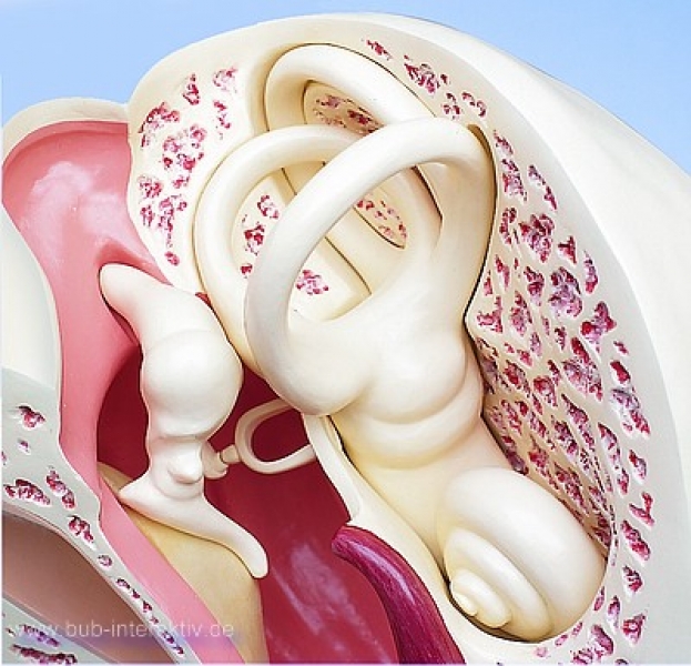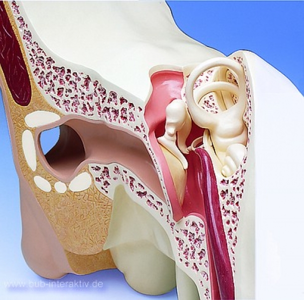 Zur genaueren Ansicht können Gehörknöchelchen, Labyrinth mit Schnecke und Hör- und Gleichgewichtsnerv herausgenommen werden.