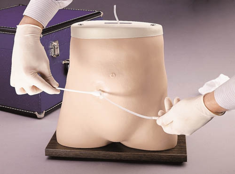Naturgetreuer Bauch- und Beckentorso zum Erlernen und Üben der kontinuierlichen ambulanten Peritonealdialyse (CAPD). Mit Tenckhoff-Katheter und Transportkoffer. Größe: 46 x 31 x 46 cm, Gewicht: 9 kg