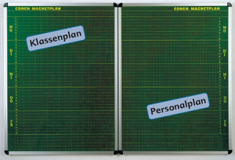 Die Oberflächen der Plantafeln bestehen aus Stahlblech grün mit eingebranntem Stundenplanraster in gelb und einem Aluminiumrahmen silberfarben.