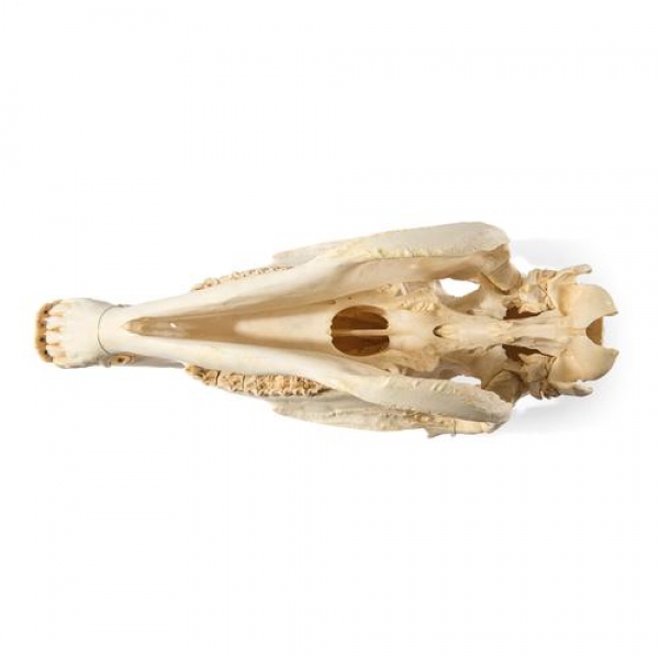 Knochenpräparat eines Pferdeschädels bestehend aus ca. 37 einzelnen Knochen, die starr miteinander verbunden sind.