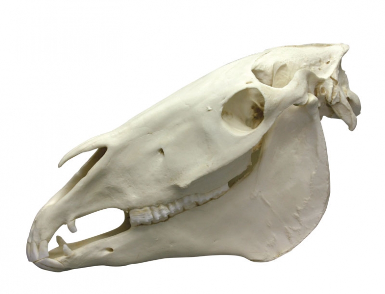 Das Originalpräparat dieser Replik war ein großes, im Ruhestand befindliches Polizeipferd. Der Schädel ist zweiteilig (separater Schädel und Unterkiefer).