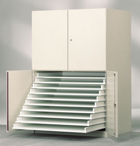 Planschrank für großzügige Bildformate, bis 100x70 cm. Zerlegbar, mit 10 Auszügen unten und 6 Böden oben.