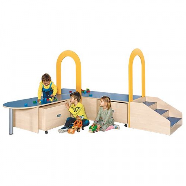 Die Podestlandschaft mit verschiedenen Podestelementen aus unserem Fertigungsprogramm bietet interessante Möglichkeiten für Spiel, Sport, Gestaltungen und die kreative Dinge des Gruppenlebens. Alle Podestoberplatten besitzen eine Linoleumoberfläche. Die 2 mm - ABS Sicherheitskanten an der Podestplatte aus 19 mm E 1-Feinspanplatte gewährleistet eine beanspruchungsfähige Kante, die den täglichen Beanspruchungen auch auf den geschwungenen Konturen ohne weiteres standhält. Die Linoleumoberfläche stellt eine strapazierfähige und pflegeleichte Oberfläche dar, sie ist aus mehreren fröhlichen Farben wählbar. Mit dem Material Linoleum steht eine geräuschdämmend, kratzfeste, abwisch- und desinfizierbare Oberfläche zur Verfügung. Das Dekor des Podestkorpus wird in mehreren Varianten angeboten: bitte wählen Sie bei der Bestellung! Die Randbereiche der Podestelemente sind in der Regel geschlossen. Die Abbildung ist ein Gestaltungsvorschlag, die einzelnen Elemente lassen sich bei Bedarf auch umgruppieren - oder können auch in anderen Kombinationen verwendet werden.
