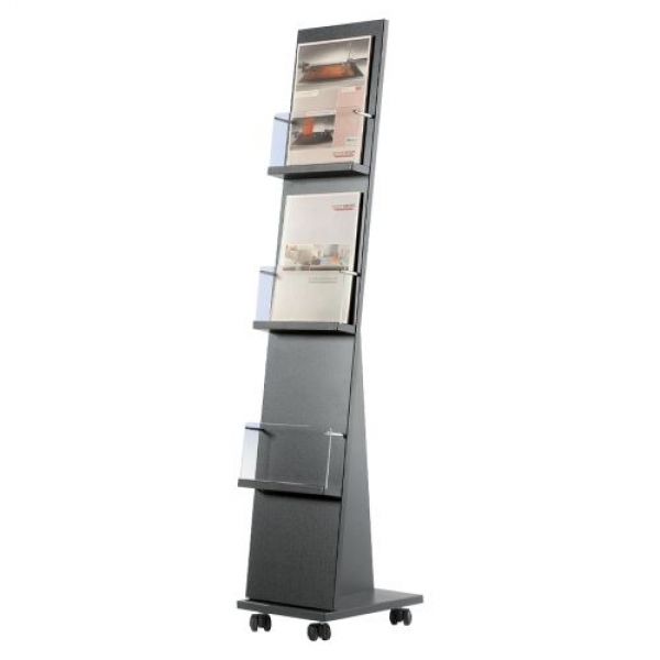 Dieser elegante, fahrbare Prospekt- und Zeitungsständer auf 4 stabilen Rollen, von denen 2 feststellbar sind, ist perfekt geeignet, um Ihre Informationsbroschüren und Zeitungen ordentlich und griffbereit aufzubewahren und perfekt zu präsentieren.