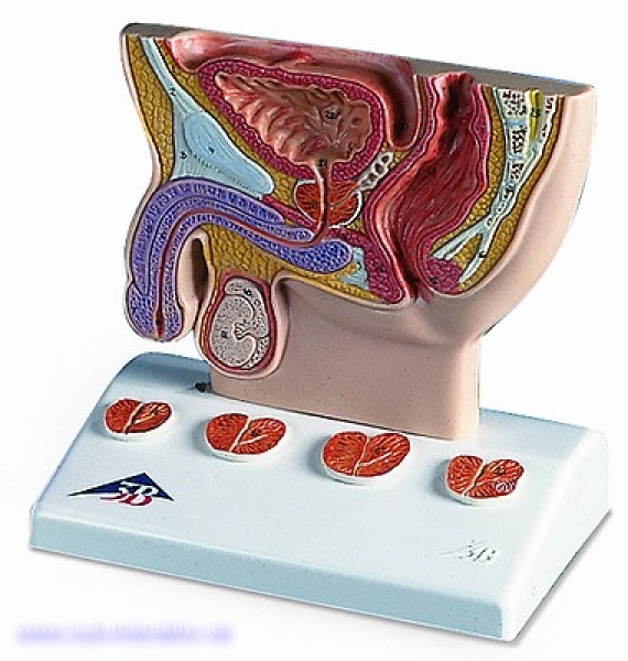 Dieser Querschnitt durch den männlichen Unterkörper zeigt eine gesunde Prostata mit Blase, Harnröhre, Penis, Hoden, Symphyse und Enddarm. Die Verengung der Harnröhre durch die erkrankte Prostata wird an 4 Querschnitten deutlich. Alle anatomischen Strukturen sind detailgetreu bemalt. Auf Sockel.
