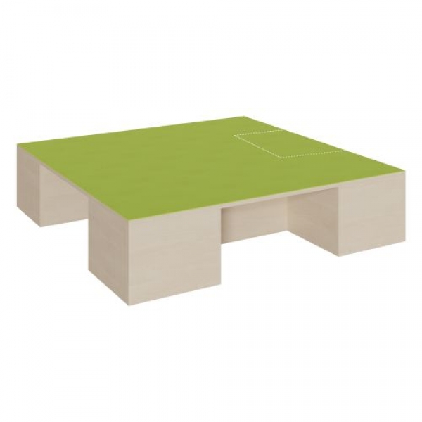 Das Linoleumpodest mit der großen Fläche von 1,5 x 1,5 m kann sowohl als erhöhte Spielebene und als auch als Bühne genutzt werden. Zugleich ist es die Garage für 3 Rollkästen. In Kombination mit anderen Podestelementen lässt es sich sehr einfach zu einer Podestlandschaft verbinden. Dann können damit auch einfache Rückzugsbereiche gestaltet werden. Die strapazierfähige und leicht zu reinigende Linoleumoberfläche kann in verschiedenen Farben gewählt werden, ebenso das Dekor des Podestes. Die Anbindung zu anderen Podestelementen kann über zusätzliche Podestverbinder (unsere Artikel Nr. KLAM) sicher gestellt werden. (Die 3. Rollkastennische -rechts hinten- ist im Bild auf der Oberplatte grafisch angedeutet.) Die Anbindung zu anderen Podestelementen kann über zusätzliche Podestverbinder (unsere Artikel Nr. KLAM) sicher gestellt werden.