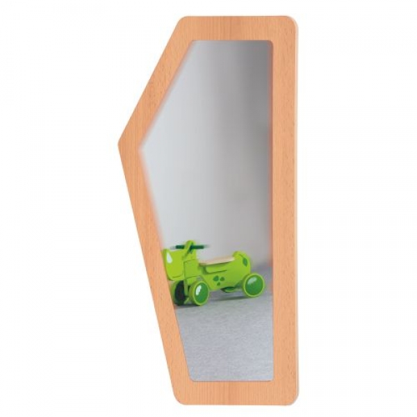 Ein Spiegel-5-Eck in der Größe B/H: 70x134 cm, der Spiegel hängt im Hochformat: hier kommen auch die Längsten mit Spiegelinteressen komplett aufs Bild! Die Spiegelfläche ist an die Grundplatten-Kontur angepasst, der Abstand beträgt allseitig ca. 8 cm.