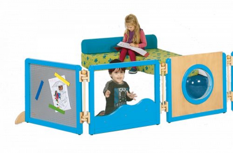 Raumteiler schaffen abgetrennte Spielzonen und Erlebnisräume. Dank verschiedener Motive und Nutzungsmöglichkeiten, lassen sie sich schnell und flexibel zu spannenden Kinderwelten mit unterschiedlichen Eingängen und Durchschlüpfen kombinieren. Verbinder dienen zur Montage der Elemente untereinander und dem Anschluss an weitere Möbel oder die Wand. Sie ermöglichen ein Aufstellen in Reihe und das Weiterbauen "um die Ecke". Bei der Gestaltung der Rahmen kann zwischen naturlackiert oder farbig abgesetzt gewählt werden.