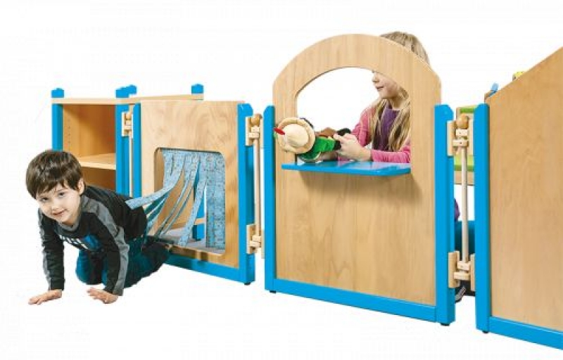 Raumteiler schaffen abgetrennte Spielzonen und Erlebnisräume. Dank verschiedener Motive und Nutzungsmöglichkeiten, lassen sie sich schnell und flexibel zu spannenden Kinderwelten mit unterschiedlichen Eingängen und Durchschlüpfen kombinieren. Verbinder dienen zur Montage der Elemente untereinander und dem Anschluss an weitere Möbel oder die Wand. Sie ermöglichen ein Aufstellen in Reihe und das Weiterbauen "um die Ecke". Bei der Gestaltung der Rahmen kann zwischen naturlackiert oder farbig abgesetzt gewählt werden.