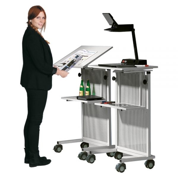 • Damit sind Kombinationen mit Rednerpult und/oder OHP-, bzw. LCD-Projektorwagen möglich, mit ein und dem selben Artikel.