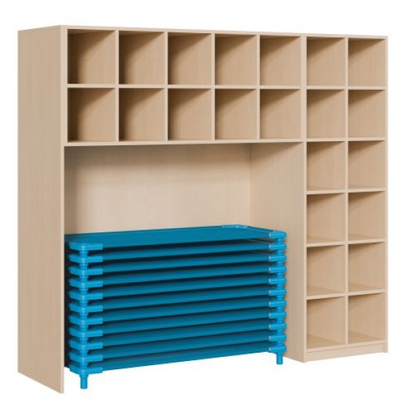Bis zu 15 Kinderliegen lassen sich in dem Regal unterbringen. Und das Praktische dabei: das Bettzeug lagert gleich in Reichweite. Sogar 22 hygienisch getrennte Fächer sind dafür vorgesehen. Das Korpusdekor können Sie nach unserem Dekorangebot wählen.