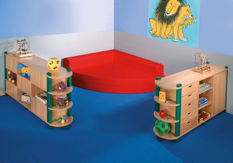 Der eingebaute Wendeschrank lädt von beiden Seiten zum Spielen ein. Alle Stollen sind aus massiver Buche gefertigt. Korpusfronten und -böden fertigen wir aus Melamin beschichteten E1 Feinspanplatten.
