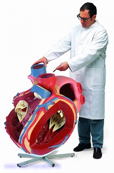 Die Vorhöfe und Kammern sind zur Innenansicht und zur Ansicht der naturgetreuen Nachbildung der Segel- und Taschenklappen sowie des Herzmuskelgewebes, der Herzwand und des Septums eröffnet.