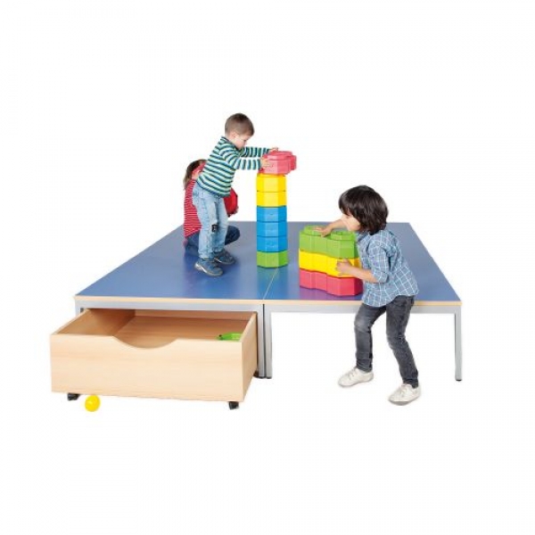 Riesenpodeste auf einem Vierkant-Stahlrohrgestell in 2 verschiedenen Größen mit Linoleumoberplatte bieten Spielfläche und Bühne in einem! Der Raum darunter kann sehr gut als Abstellraum für Rollkästen (z.B. Artikel Nr.: RK 10) genutzt werden.