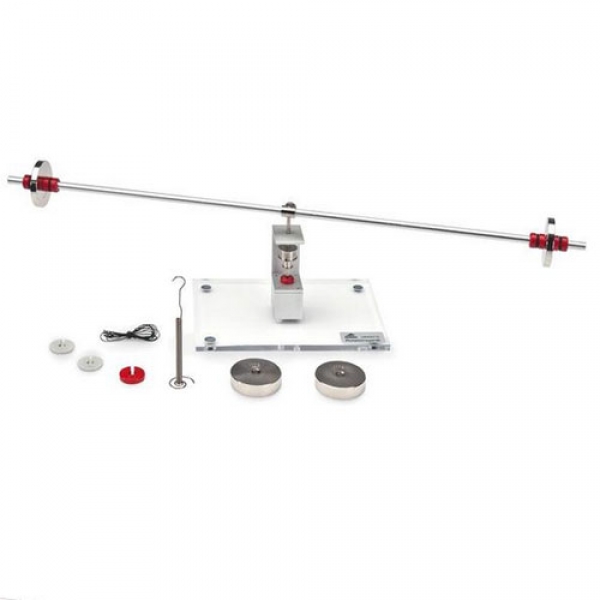 Rotationsgerät zur Bestimmung der Winkelbeschleunigung in Abhängigkeit des Drehmoments und zur Bestimmung des Trägheitsmoments in Abhängigkeit des Abstandes von der Drehachse und der Masse.