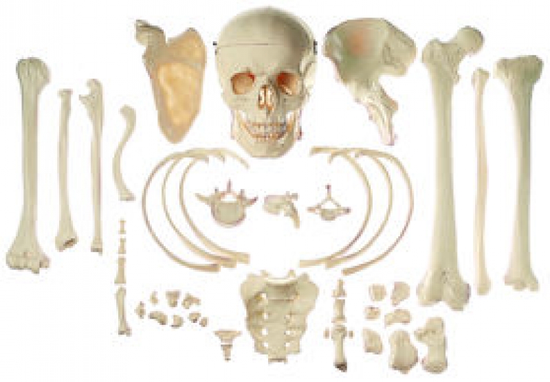 Naturabguß, aus SOMSO-Plast®. Bestehend aus Schädel (3-teilig), Schulterblatt, Schlüsselbein, je ein Ober- und Unterarmknochen, Handwurzelknochen, Knochen des Zeigefingers, je 3 rechte und linke Rippen, je 1 Hals-, Brust- und Lendenwirbel, 1 Beckenknochen, Kreuzbein, Steißbein, je 1 Ober- und Unterschenkelknochen, Fußwurzelknochen und Knochen der großen Zehe. In Plastikbeuteln im Versandkarton.