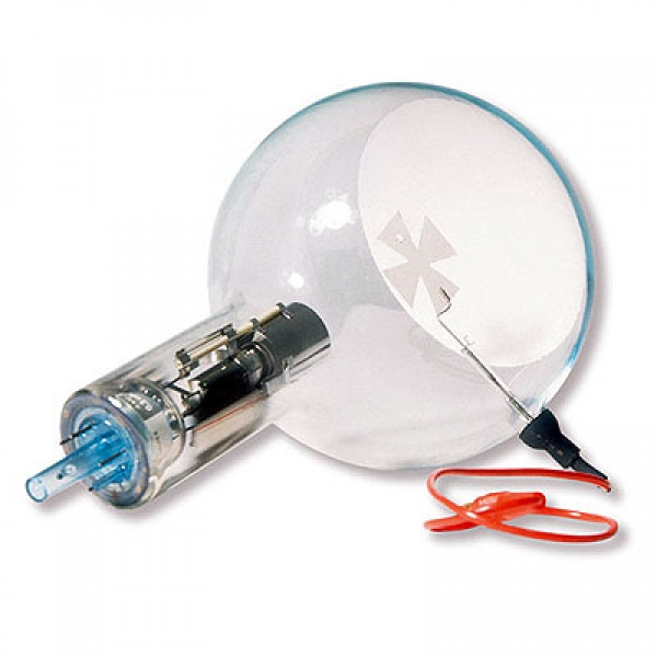 Hochevakuierte Elektronenröhre mit divergenter Elektronenkanone, Leuchtschirm und Malteserkreuz. Zum Nachweis der geradlinigen Ausbreitung von Elektronen im feldfreien Raum durch Schattenprojektion des Malteserkreuzes auf den Leuchtschirm und zur Einführung in die Elektronenoptik.