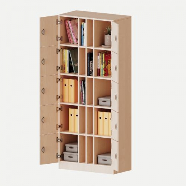 Alle Schließfach Schränke werden aus melaminharzbeschichteter E1 Feinspanplatte gefertigt, die FSC zertifiziert und formaldehydfrei sind. Als Kanten verwenden wir besonders robuste 2 mm starke ABS Kanten, die unter hoher Temperatur fest verleimt werden. Bitte wählen Sie Ihr Wunschdekor aus unserer Dekorpalette aus. Die Einlegeböden sind im Raster von 32 mm verstellbar. Unsere hochwertigen Bodenträger verfügen über einen "Ausziehstop", so wird verhindert, dass Böden mit Inhalt darauf aus dem Regal oder Schrank rutschen können. Die Türen lassen sich dank 270° offnender Scharniere an den Korpus anlegen. Sie sind mit einem Schloss verschließbar. An den Türen befindet sich eine Staublippe.