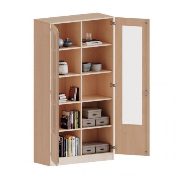 Die Türen öffnen 270°, sind abschließbar und mit einem Glasausschnitt versehen. Die Glaseinlage besteht aus Sicherheitsgründen aus Acrylglas, ist von innen eingesetzt und auf der Tür von innen verschraubt. So sehen Sie schnell, was im Schrank untergebracht ist. Besonders praktisch für Sammlungen.