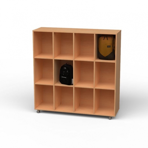 Schulranzen-Regal XXL 12 Fächer fahrbar BxHxT 148,5x150x45 cm offen, 3 Trennwände, 4x2 feste Fachböden ( nicht verstellbar ) 4 Rollen, 2 davon feststellbar Fachmaße BxHxT: 34,75x45,8x42 cm