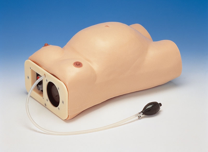 Dieses phantastische Modell ermöglicht das Üben der Untersuchung mit den 4 Leopold-Handgriffen, die externe Beckenvermessung, das Abhören der fetalen Herztöne und die Brustpflege.