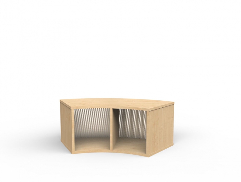 Sechstelkreisschrank H= 47,1 cm Außenradius ca. 102 cm Innenradius ca. 63 cm Gesamttiefe 40 cm Fachinnenmaß. BxHxT ca. 48,2 (28,7)  x34,1x37,6 cm Lochblech / Silberfarben im Außenradiusmit 2 offenen Fächern