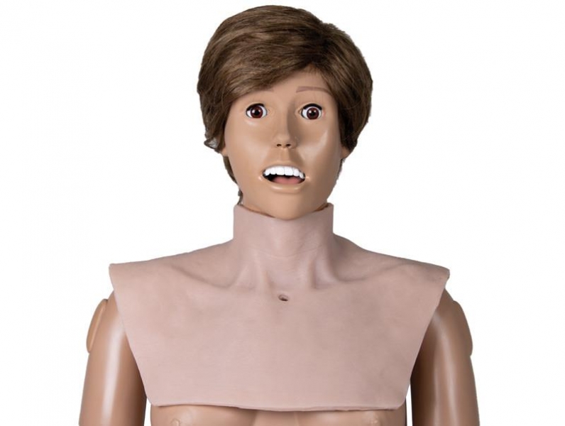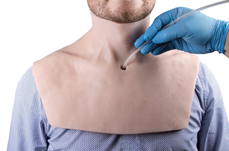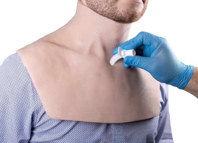 Dieser Simulationskragen kann einem Schauspieler oder einer Puppe angelegt werden und ermöglicht die Übung der Tracheostomiepflege und -absaugung lebensecht am Menschen.