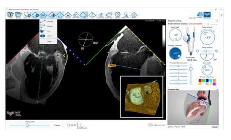 Die Bildschirmschnittstelle zeigt nicht nur TEE-Bildern ähnliche 2D-Querschnitte, sondern auch die Komponenten der Sondenbewegung, wie Sondentiefe, Kurven, Drehung oder den Winkel der Bildgebungsebene.