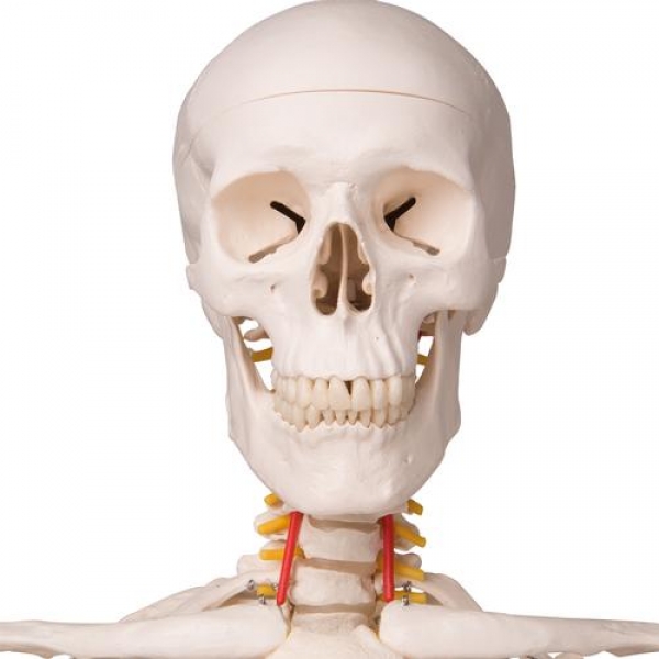 Unser Lehrmittel-XXL- Anschauungsskelett Fred beinhaltet alle Vorzüge eines anspruchsvollen Schulskelettes. Zusätzlich kann Freds biegsame Wirbelsäule so gut wie jede menschliche Bewegung nachmachen. Einmal gebogen, verbleibt Fred in der jeweiligen Position, um richtige und falsche Haltungen sowie pathologische Fehlstellungen deutlich zu machen. Alle Schädelbewegungen sind an den Kopfgelenken demonstrierbar. Austretende Spinalnerven und Vertebralarterien sind an diesem Skelett ebenso dargestellt wie ein dorsolateraler Bandscheibenvorfall zwischen dem 3. und 4. Lendenwirbel. Jetzt neu auf stabilem Metallstativ mit 5 Rollen! Das sind weitere Vorzüge von Fred: