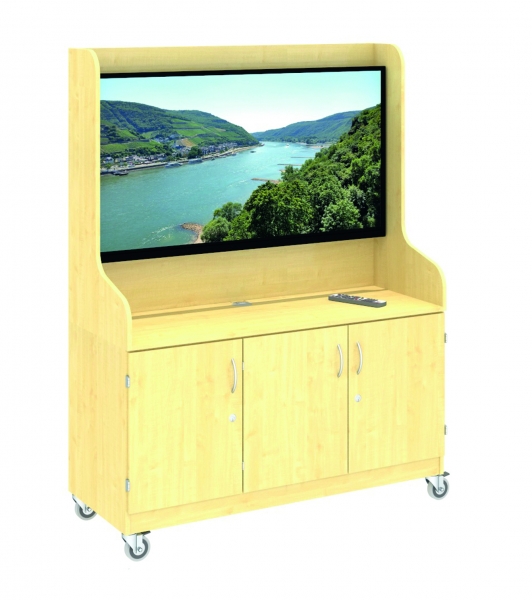 TV- und MultimediawagenArtikel-Nr.: 1070-7150-123BxHxT 160x200x62 cmfür große Flachbildschirme bis zu einer Breite vonmaximal 155 cm (ca. 65 Zoll).Das aufmontierte Bildschirm-Paneel zwischen2 Freiform-Seitenteilen ist nach vorne versetzt zurUnterbringung von Kabeln und Steckdosen.Die Aufhängung des Bildschirmes erfolgt an einerintegrierten VESA-Halterung.Fahrbarer Unterschrank mit oben verkürzter Rückwandals Kabeldurchlass, 3 abschließbare Türen,2 Trennwände und 3x2 Einlegeböden.Verdeckt im Sockel eingebautes Stahlrahmengestellmit 4 leicht laufenden Rollen (2 davon feststellbar)