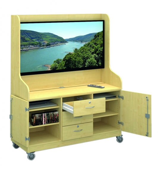 TV- und MultimediawagenArtikel-Nr.: 1070-7150-343BxHxT 160x200x62 cmfür große Flachbildschirme bis zu einer Breite vonmaximal 155 cm (ca. 65 Zoll).Das aufmontierte Bildschirm-Paneel zwischen2 Freiform-Seitenteilen ist nach vorne versetzt zurUnterbringung von Kabeln und Steckdosen.Die Aufhängung des Bildschirmes erfolgt an einerintegrierten VESA-Halterung.Fahrbarer Unterschrank mit oben verkürzter Rückwandals Kabeldurchlass, 2 abschließbare Türen, 2x2 Einlegeböden3 abschließbare Schubkästen mit Vollauszug mit SoftClose.Verdeckt im Sockel eingebautes Stahlrahmengestellmit 4 leicht laufenden Rollen (2 davon feststellbar)