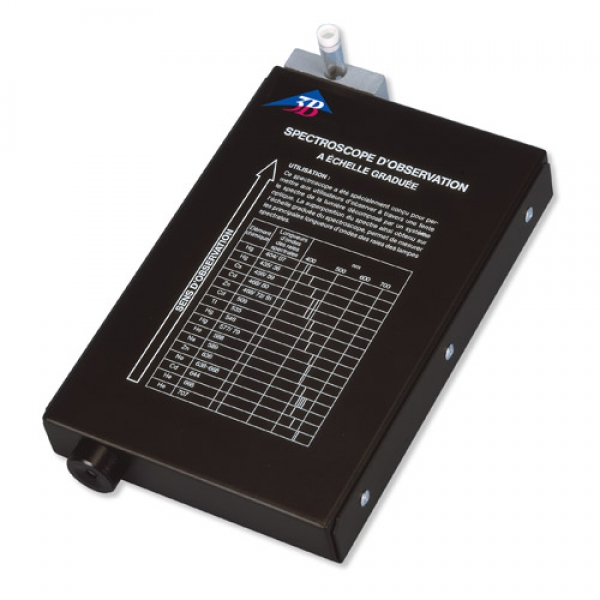 Handspektroskop in flachem Metallgehäuse mit eingebauter Wellenlängenskala zur direkten Grobbestimmung der Wellenlängen von Spektrallinien.