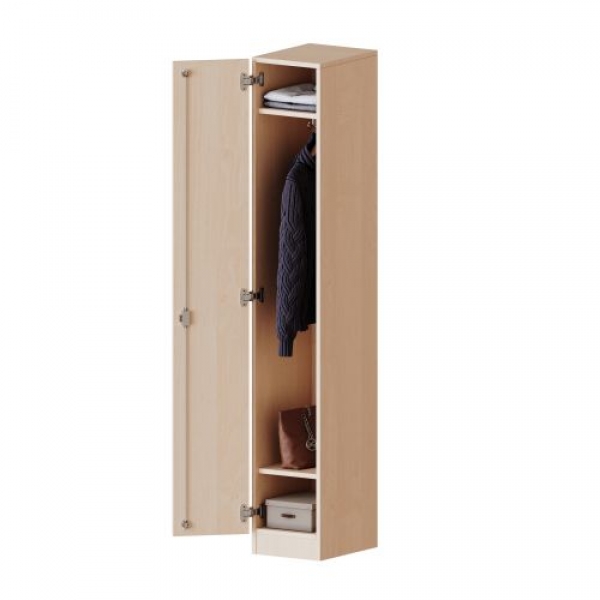 Im Inneren befinden sich Ablagen für Schuhe, Mützen oder Hüte, Dreifachhaken. Ideal als Garderobeneinheiten für mehrere Schüler in Kombination mit anderen Spinden. DIe Türen sind abschließbar und öffnen 270°.