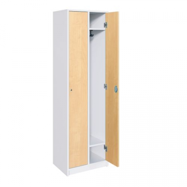 Schließfachschrank aus feuerhemmendem B1-Material mit Buche-Dekor mit verschieden schließenden Türen mit Rechtsanschlag. In jedem Abteil befindet sich jeweils oben ein fester Hutboden mit einem drehbaren Dreifachhaken (Farbe wählbar) an der Unterseite, bei durchgehenden Türen / Fächern im unteren Teil ein zusätzlicher Fachboden als Abdeckung für das Schuhfach. Jedes Fach verfügt über ein Lüftungsgitter in der Rückwand.