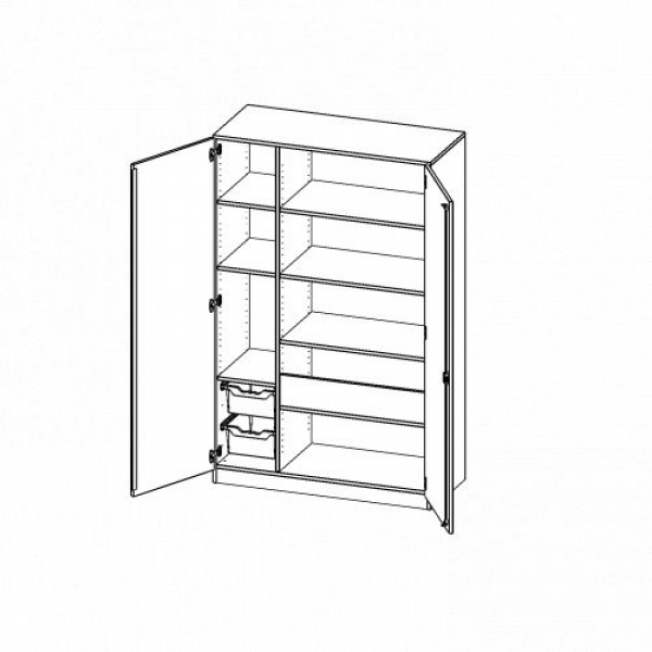 Alle Schränke werden aus melaminharzbeschichteter E1 Feinspanplatte gefertigt, die FSC zertifiziert und formaldehydfrei sind. Als Kanten verwenden wir besonders robuste 2 mm starke ABS Kanten, die unter hoher Temperatur fest verleimt werden. Bitte wählen Sie Ihr Wunschdekor aus unserer Dekorpalette aus. Die Einlegeböden sind im Raster von 32 mm verstellbar. Unsere hochwertigen Bodenträger verfügen über einen "Ausziehstop", so wird verhindert, dass Böden mit Inhalt darauf aus dem Regal oder Schrank rutschen können. Die Türen lassen sich dank 270° öffnender Scharniere an den Korpus anlegen. Sie sind mit einem Schloss verschließbar. An den Türen befindet sich eine Staublippe.